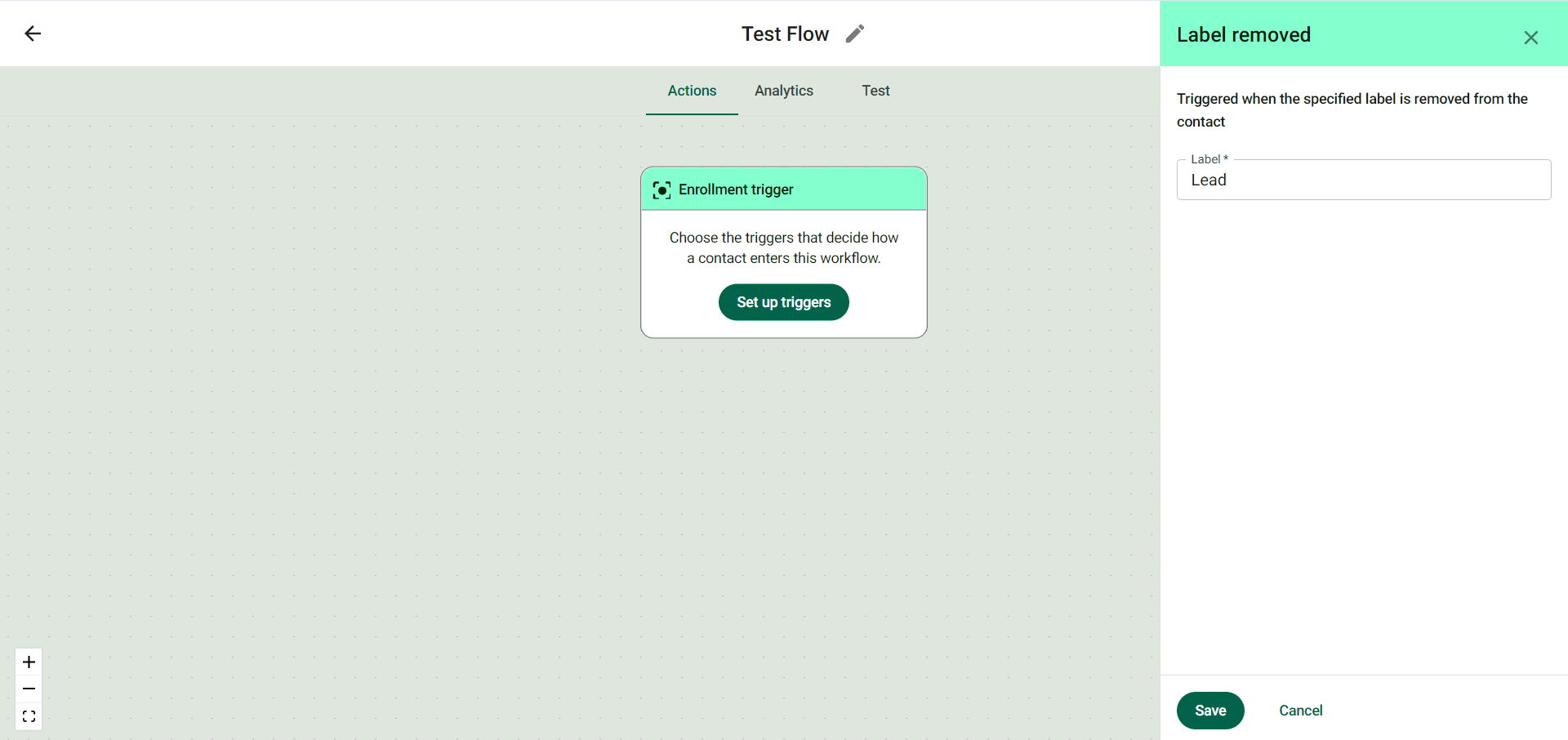 Step 3: Now, enter the label, upon removal of which from a contact, the entire workflow will be triggered. Congrats! You have successfully set up triggers using ‘Label removed’.