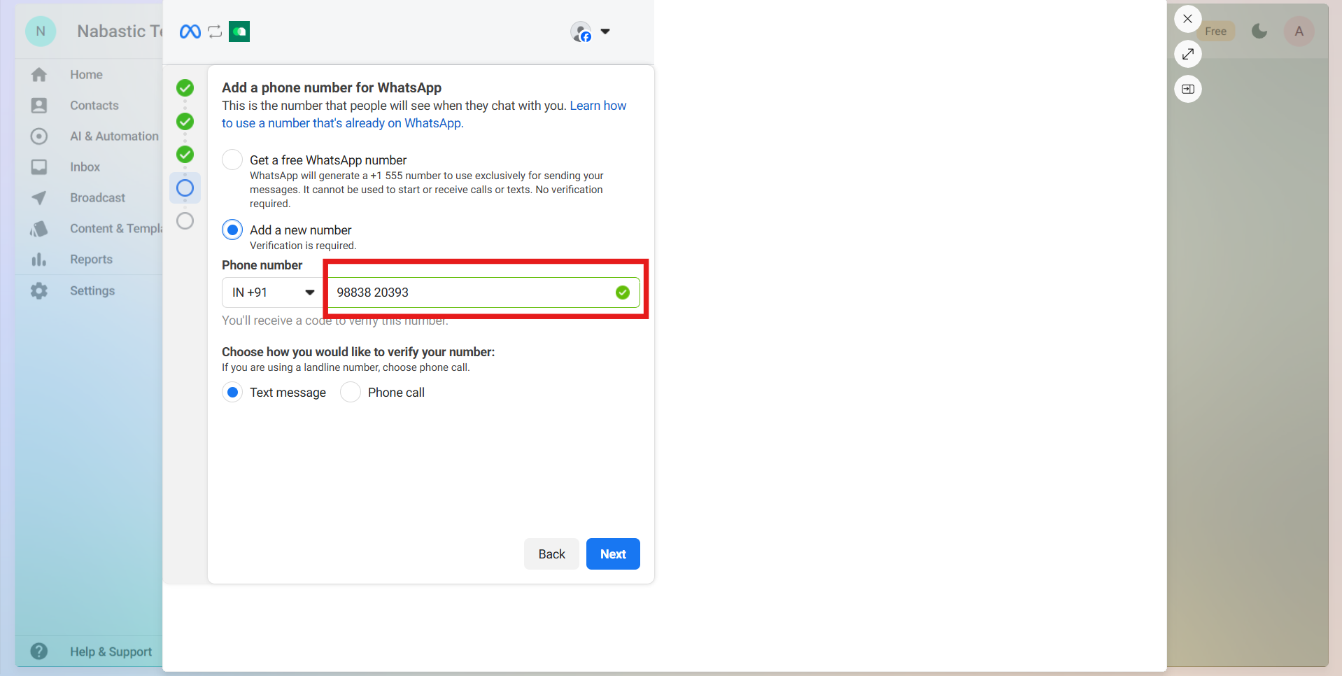 Step 7: Now, you can either get a free WhatsApp Number from Meta or add an existing number. Once done, click on ‘Next’.