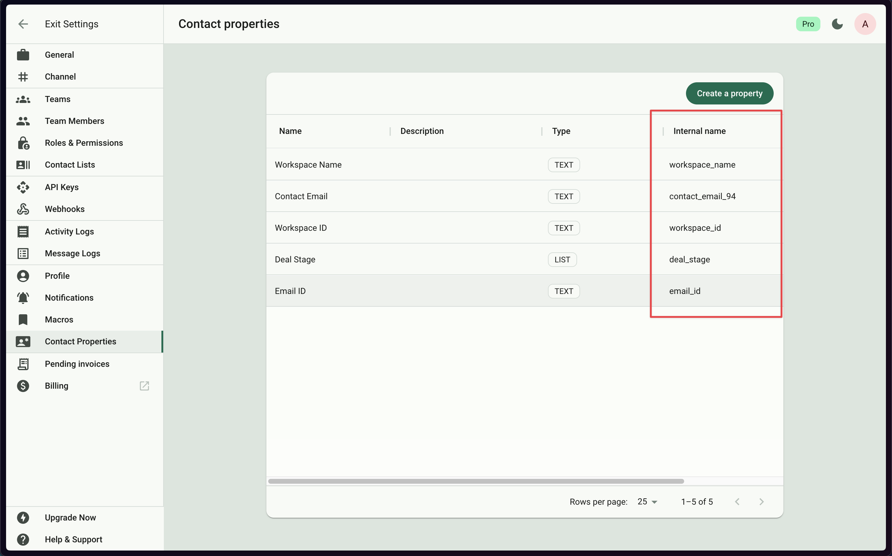 The internal name can be found in Settings→Contact Properties, under Internalname.