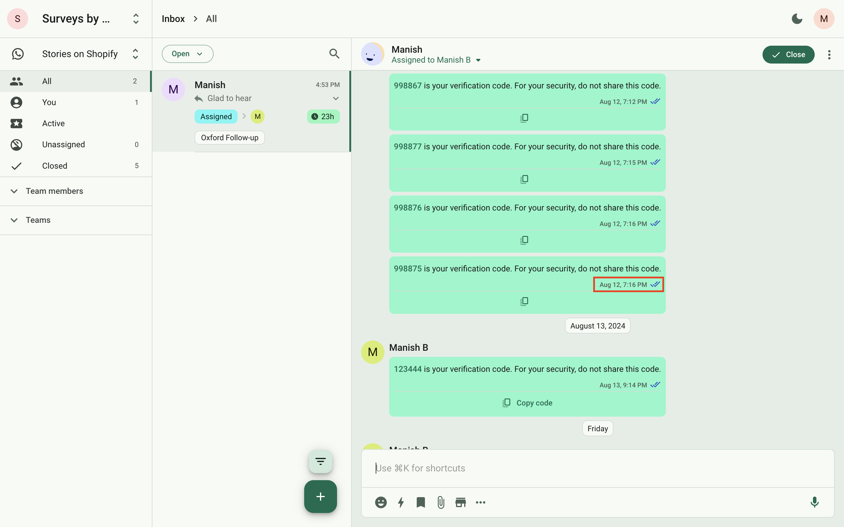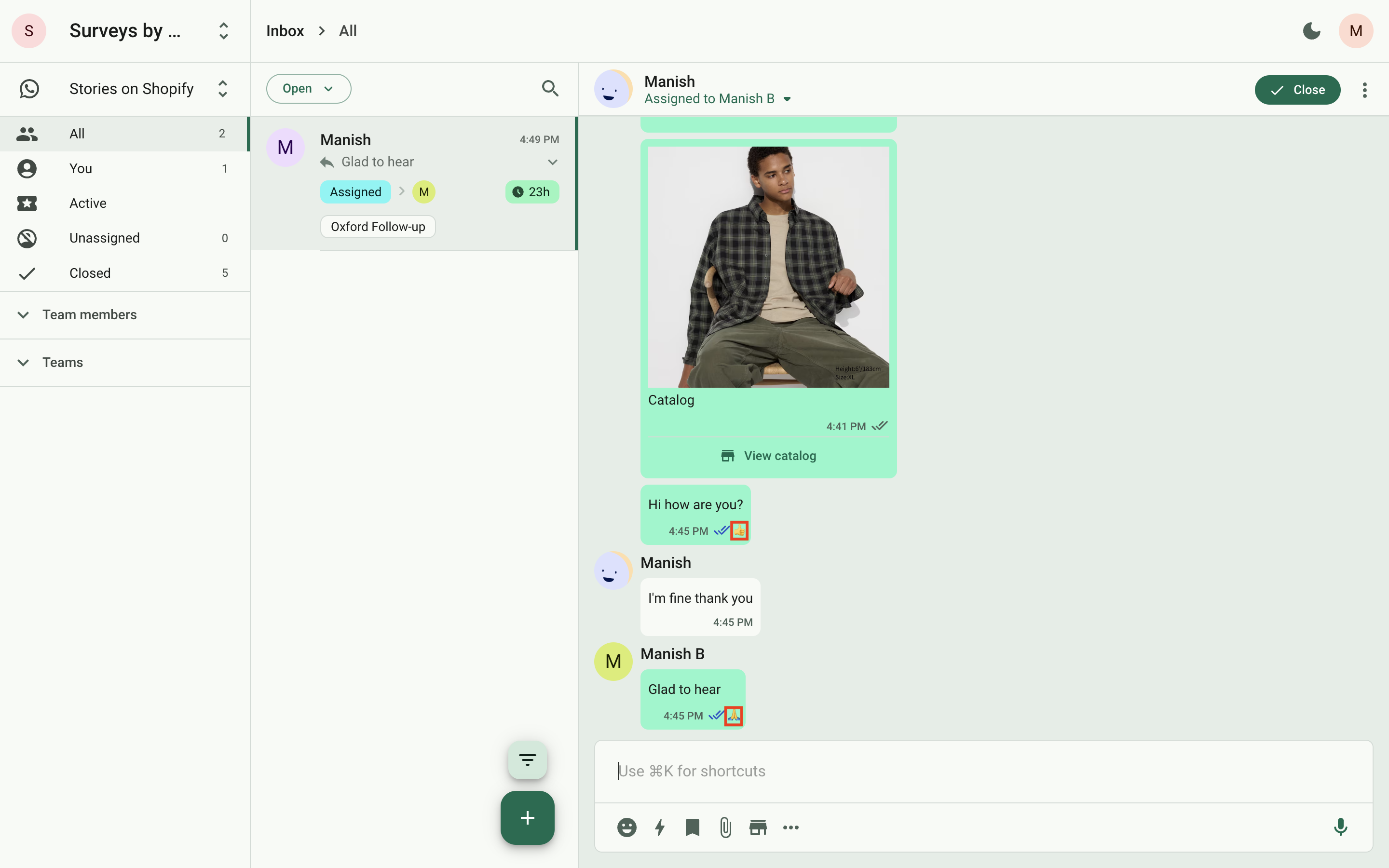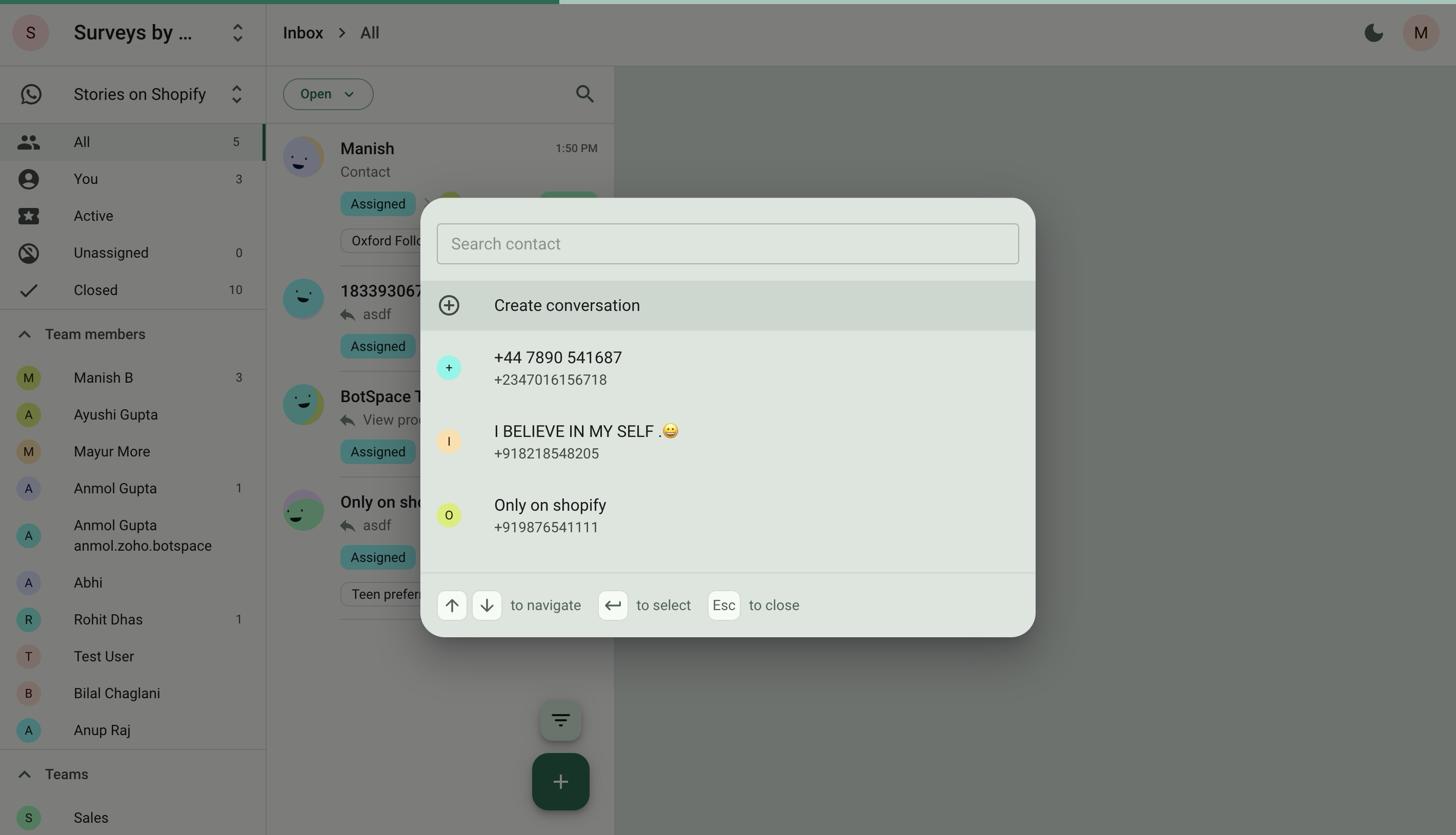 Bulk operations are supported for actions such as assign, close, follow up etc. Hover over a contact avatar to select